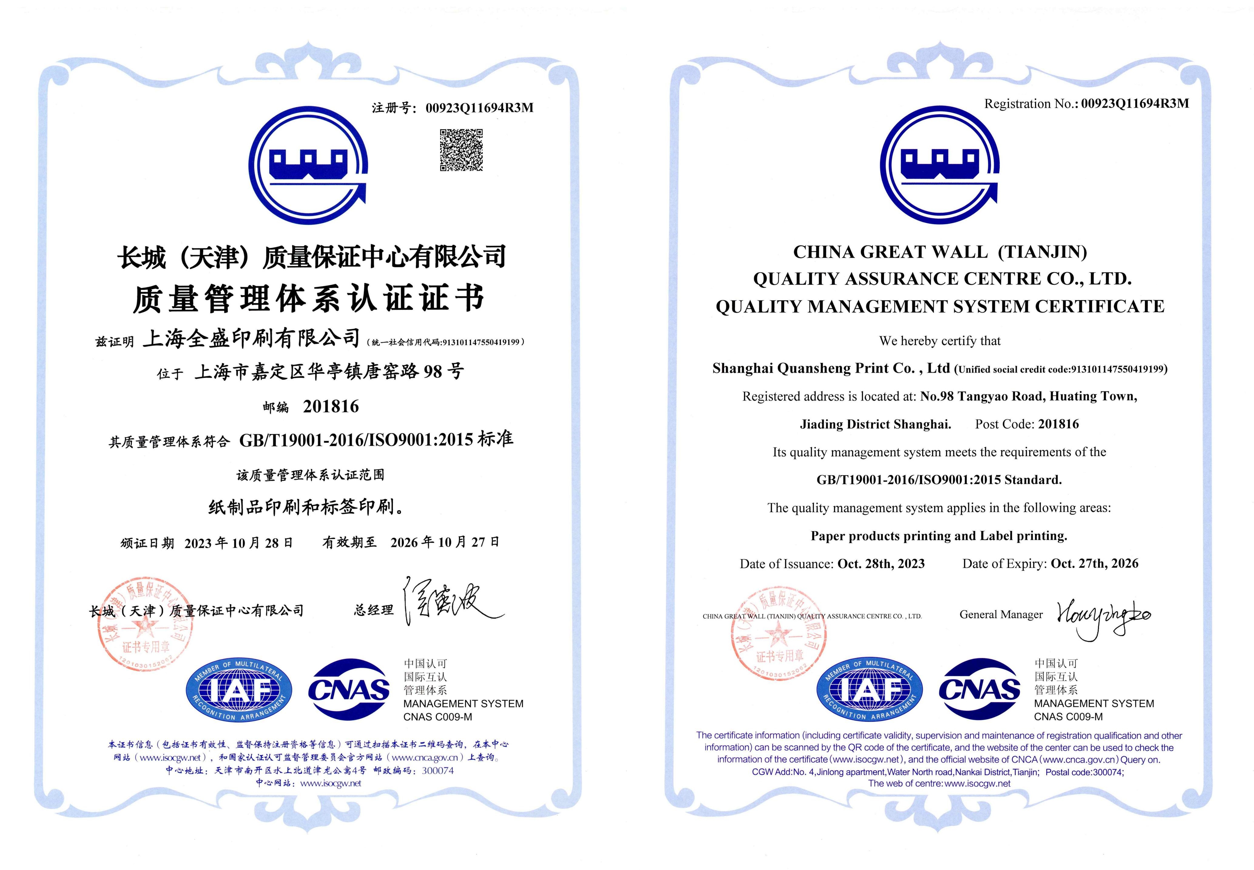 2023月10月,全盛印刷获得ISO9001质量管理体系认证证书。全盛集团结合企业实际情况,建立了一套科学、系统、全面的质量管理体系,有助于企业未来可持续发展。